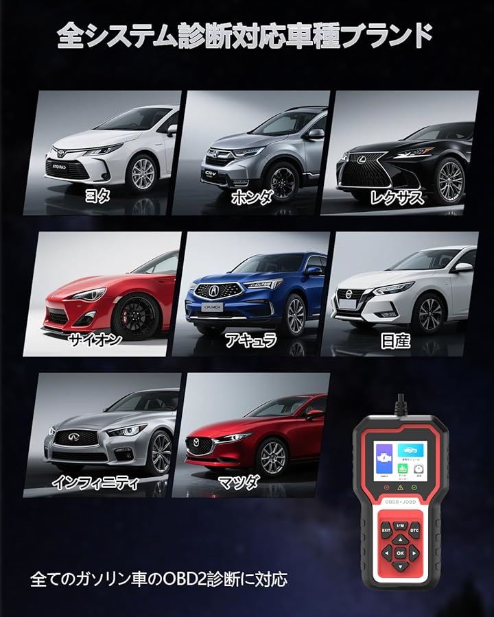 「OE全システム診断JOBDプロトコルが日本の主流車種を網羅。」「トヨタ/ホンダ/レクサス/サイオン/アキュラ/日産/インフィニティ/マツダ」の8大ブランドを含みます。