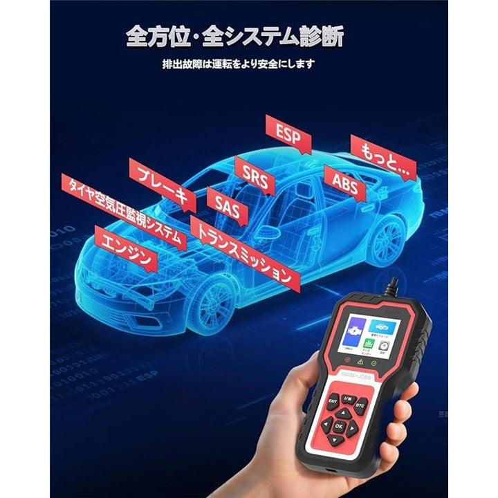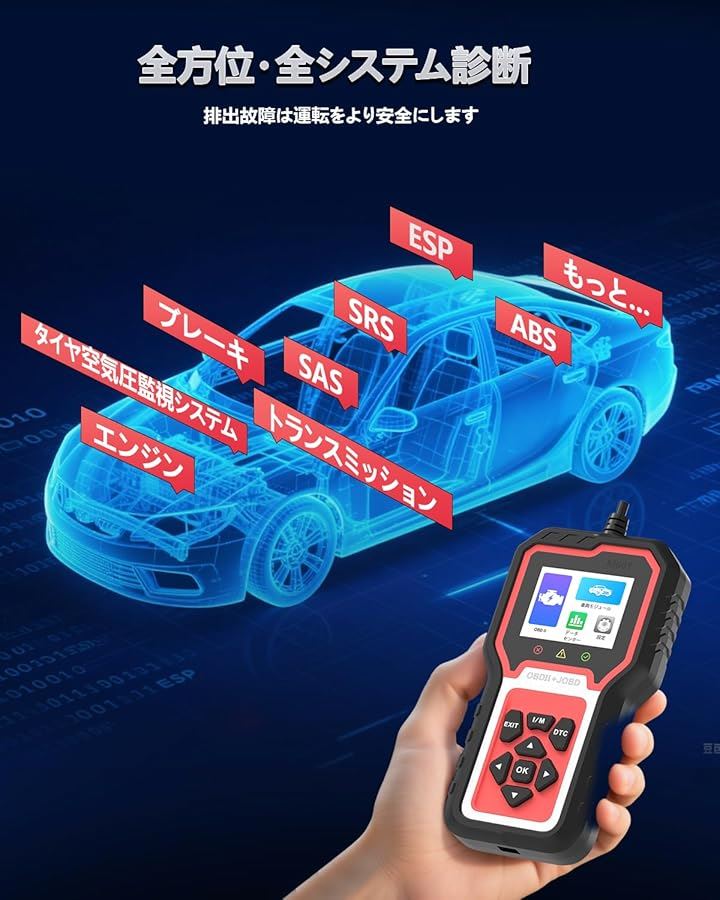 ABS、エアバッグ、エンジン、エアバッグ、トランスミッション、TPMSシステムなど、車に搭載されているシステムから、汎用だけでなく強化された故障コードも7000以上検出できます。