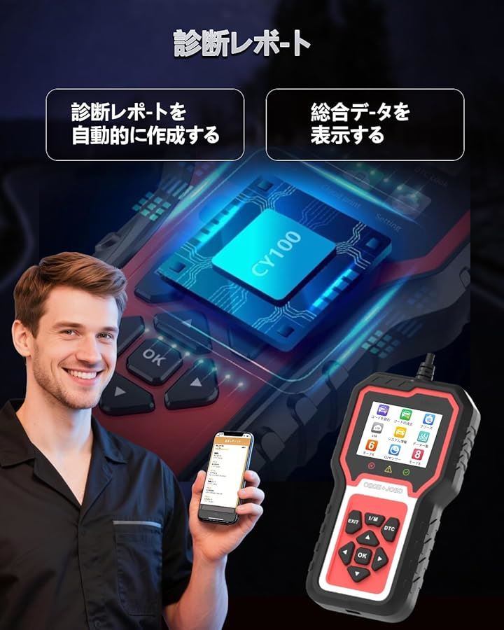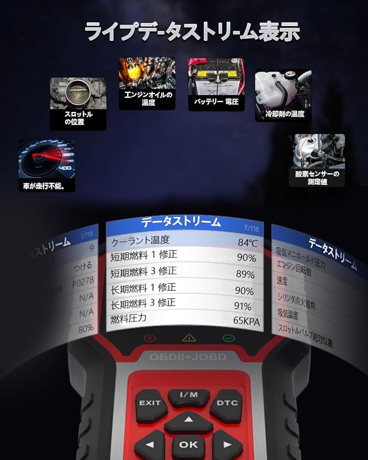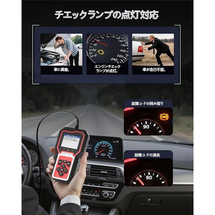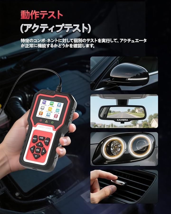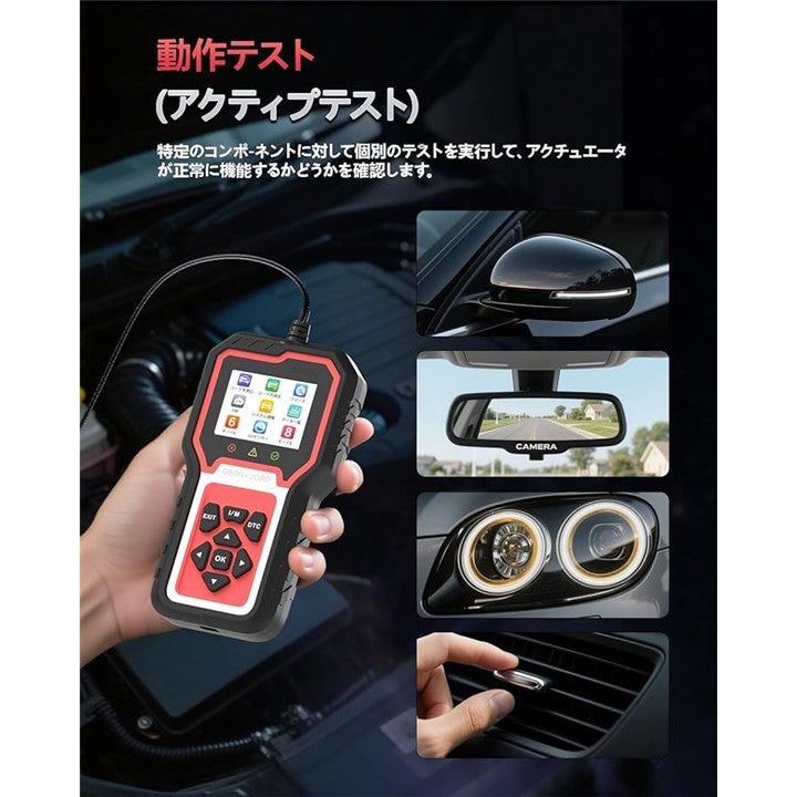 具体的には、故障コード(DTC)の読み取り・消去、エンジンチェックランプの消灯、EVAPシステムテスト、O2センサーテスト、リアルタイムデータストリームの取得、フリーズフレームデータの表示、車載監視テスト、車両情報の読み取り、DTC検索などを含みます。
