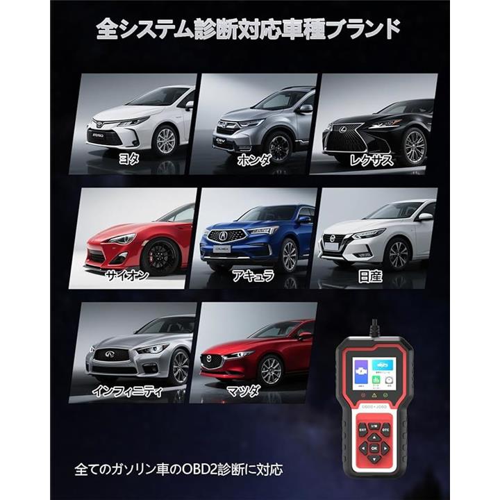 「車種互換性」8大ブランド:トヨタ、ホンダ、レクサス、サイオン、アキュラ、日産、インフィニティ、マツダのガソリン車は、「OBD2+JOBD」独自プロトコルを使用して全システム診断が可能です。