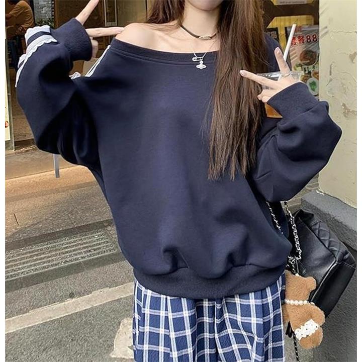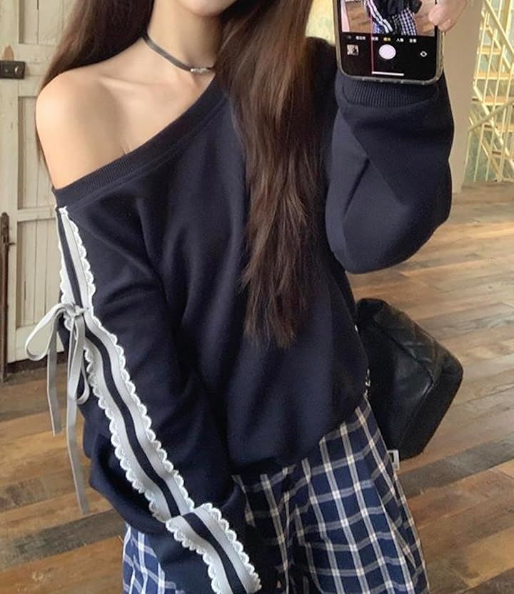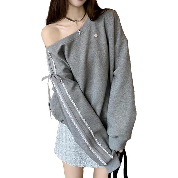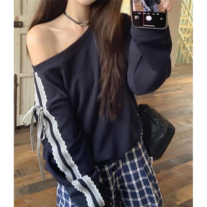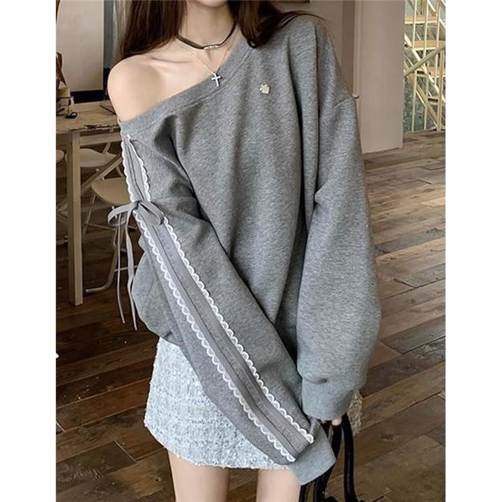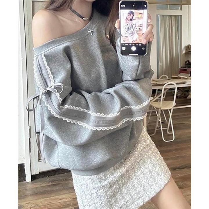 レース フリル ストライプ リボン オフショルダー 長袖 スウェット レディース 秋 韓国風 カジュアル ゆったりトップス 斜め肩 かっとそー しゃつ 可愛い カワイイ かわいい