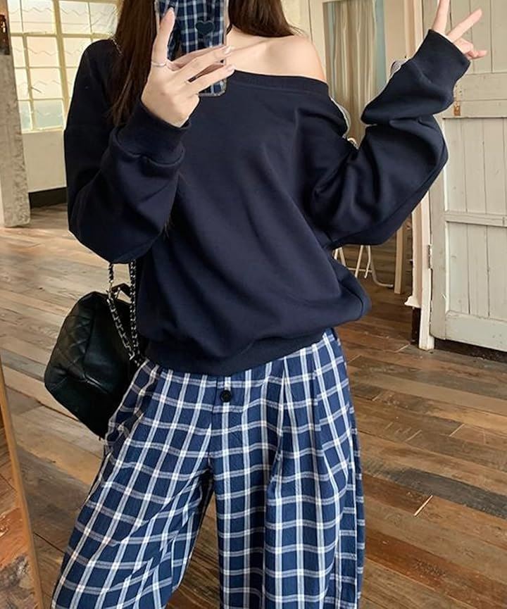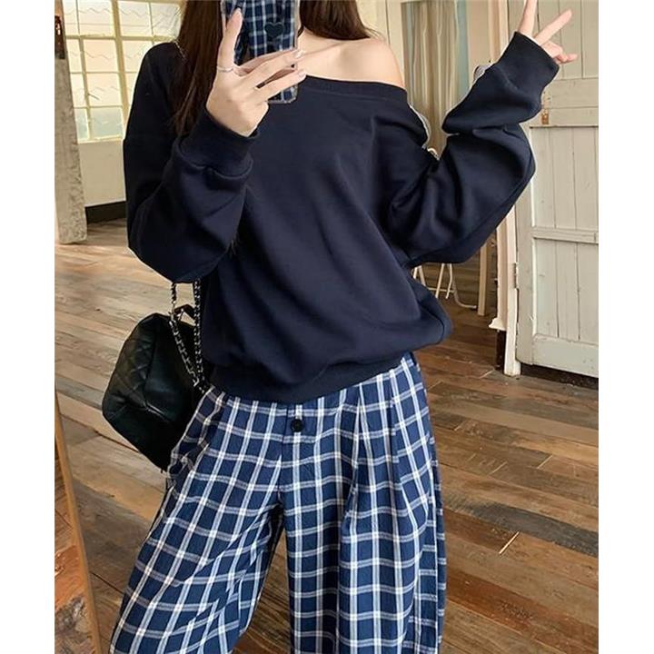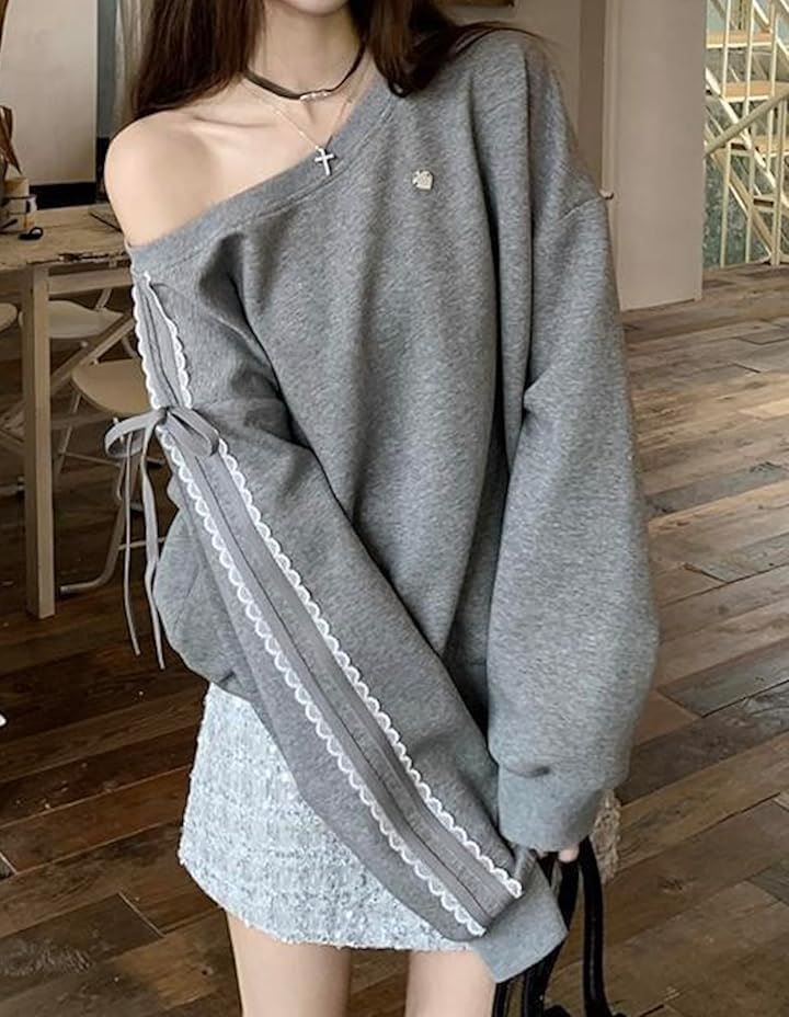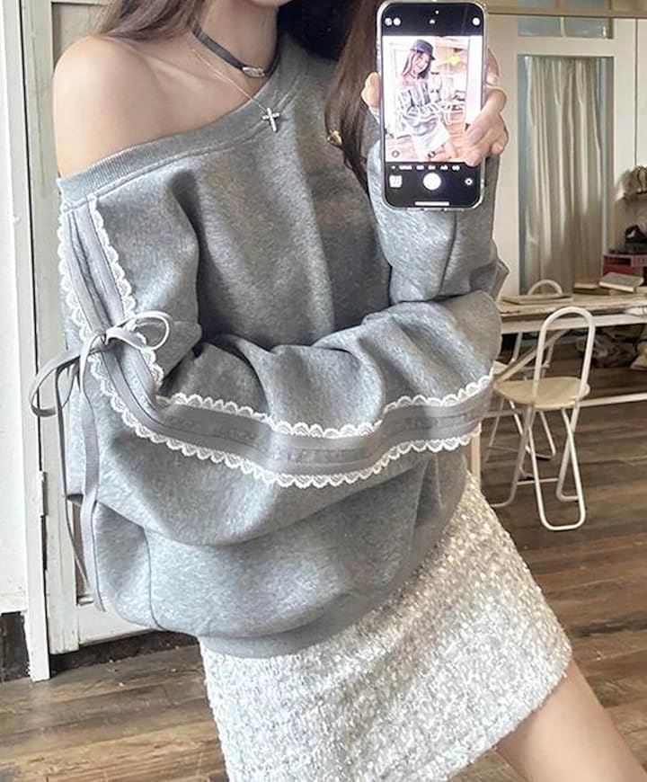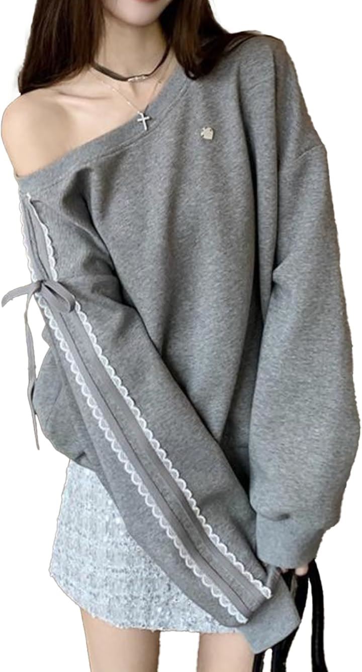 レース フリル ストライプ リボン オフショルダー 長袖 スウェット レディース 秋 韓国風 カジュアル ゆったりトップス 斜め肩 かっとそー しゃつ 可愛い カワイイ かわいい