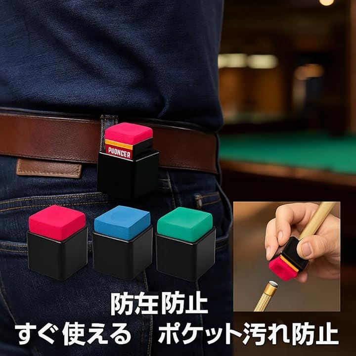 クリップ式やマグネット式の設計により、ベルトやポケット、キューケースなどに取り付けられます。