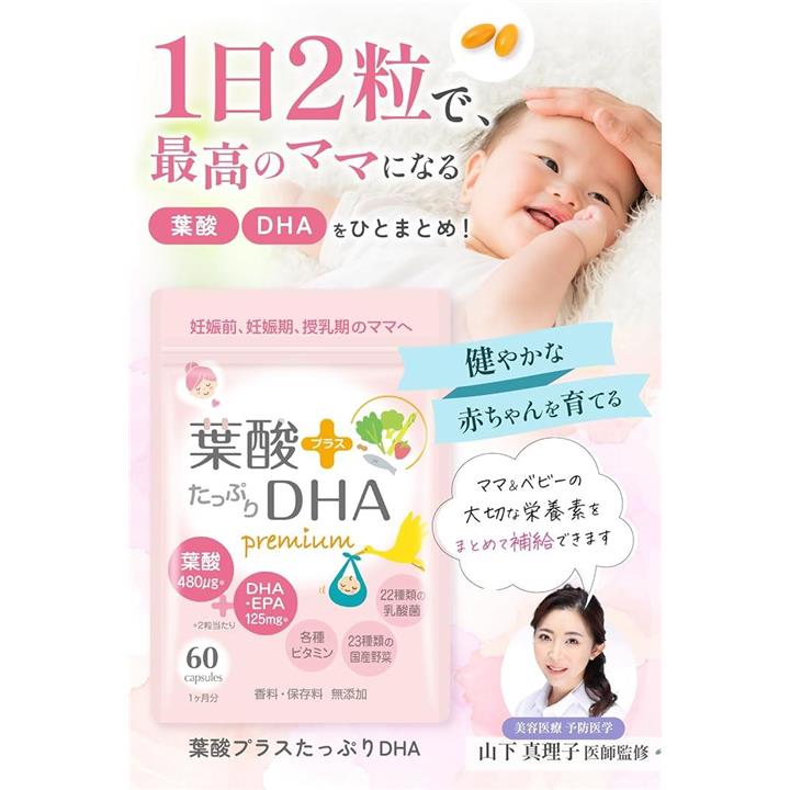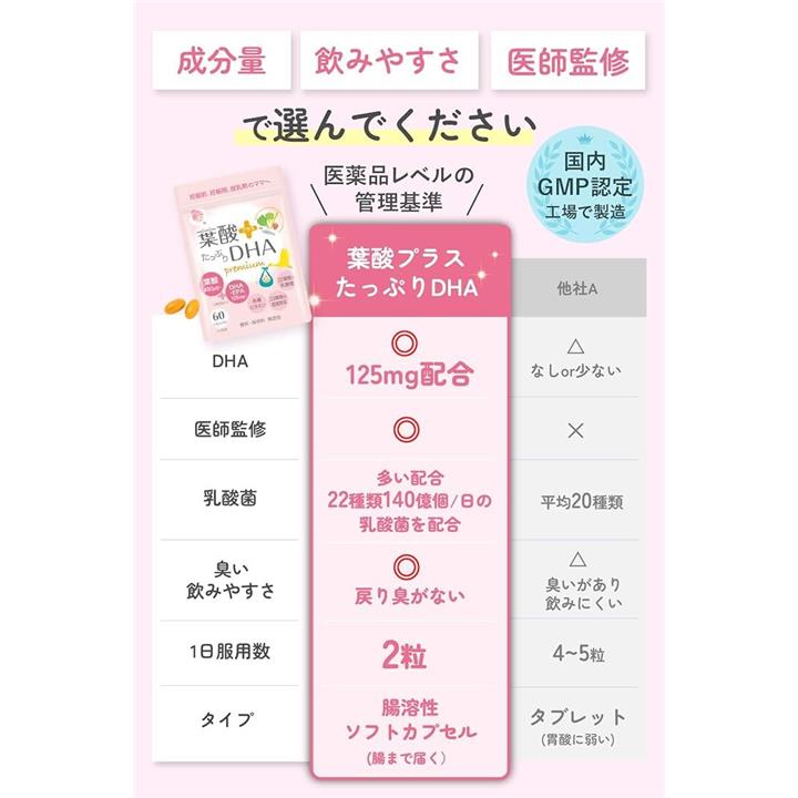 また、妊活期から授乳期まで積極的に摂取したいオメガ3脂肪酸(DHA 125mg/日)、プロバイオティック(22種類 140億個/日の乳酸菌)を配合。