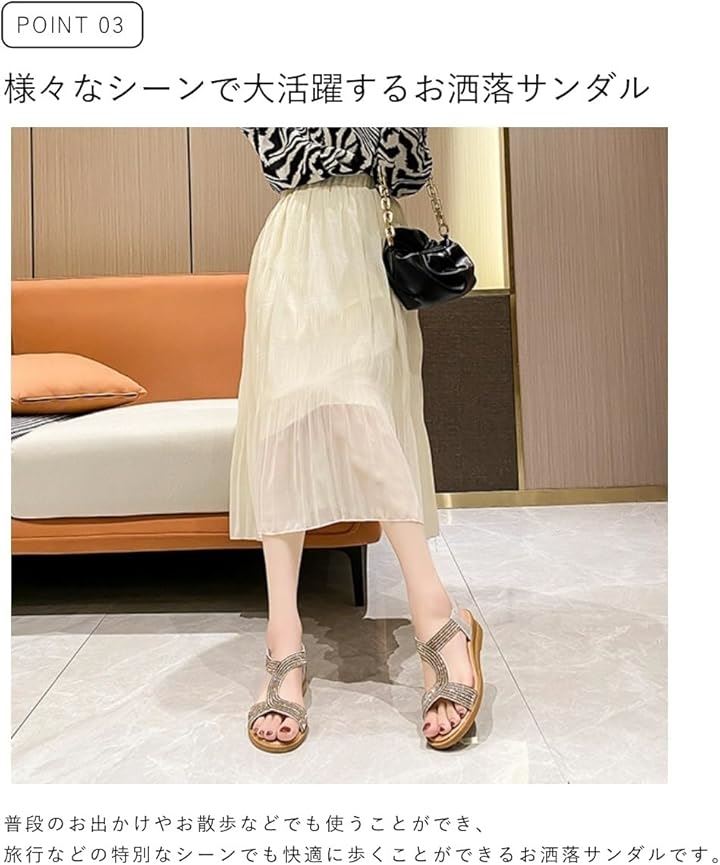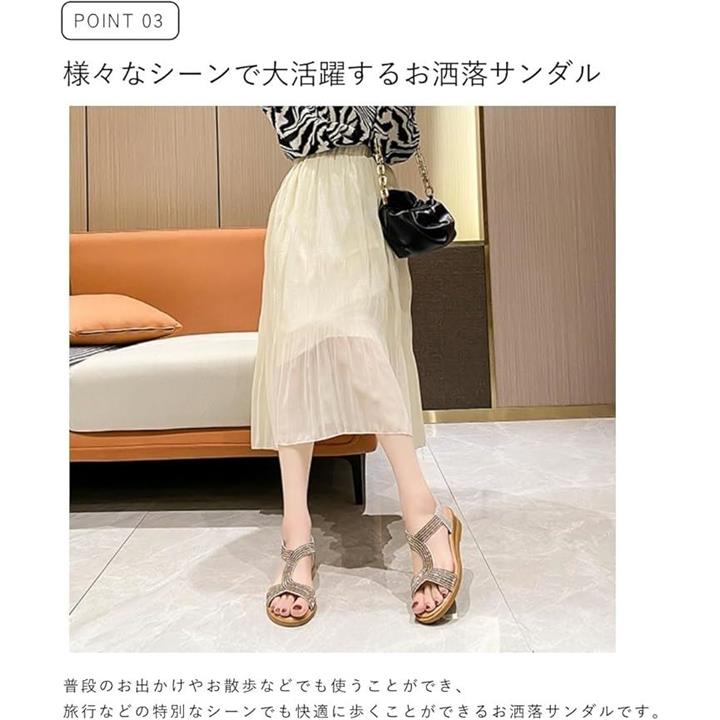 「特徴」脚を綺麗に美しく見せるラインストーン風の装飾やT字型のストラップデザインが魅力です。
