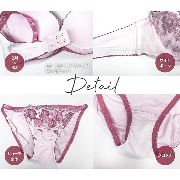 「 特徴 」 刺繍 / 花柄 / レース / エレガント / チュールドレープ / サイドストリングショーツ / ストレッチ / チャーム / ストラップ調整可 ・ 取り外し可 / パッドポケットなし / 取り外しパッドなし / 下厚カップ約 1cm / サイドボーンあり / 伸縮性あり / 2列x3段ホック / 3列3段ホック ( D85、E80~85 / F80~85 )
