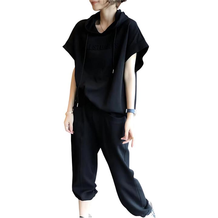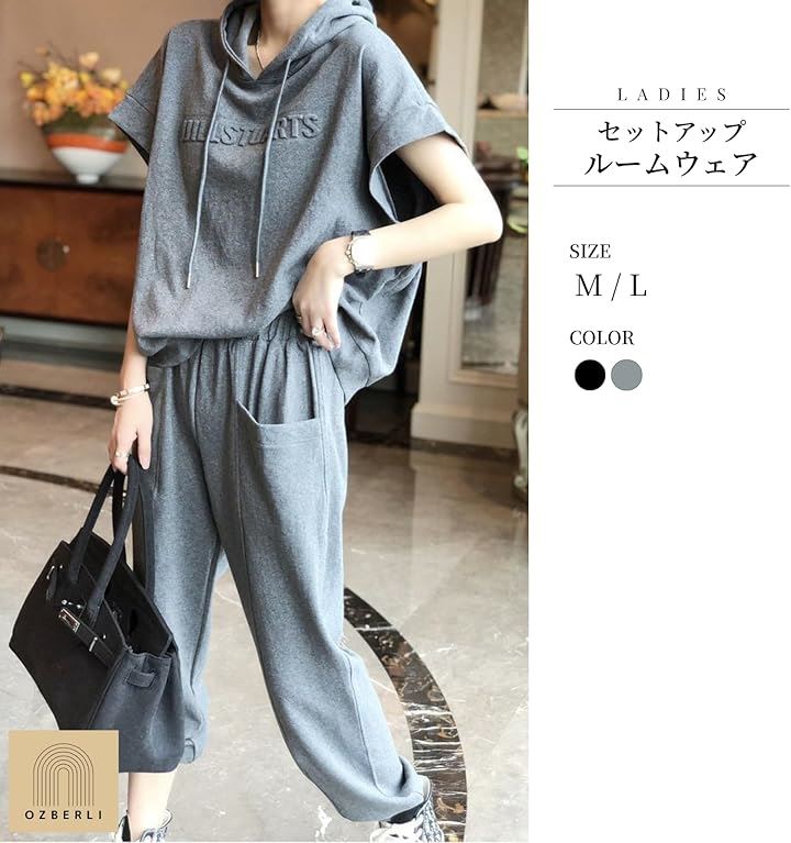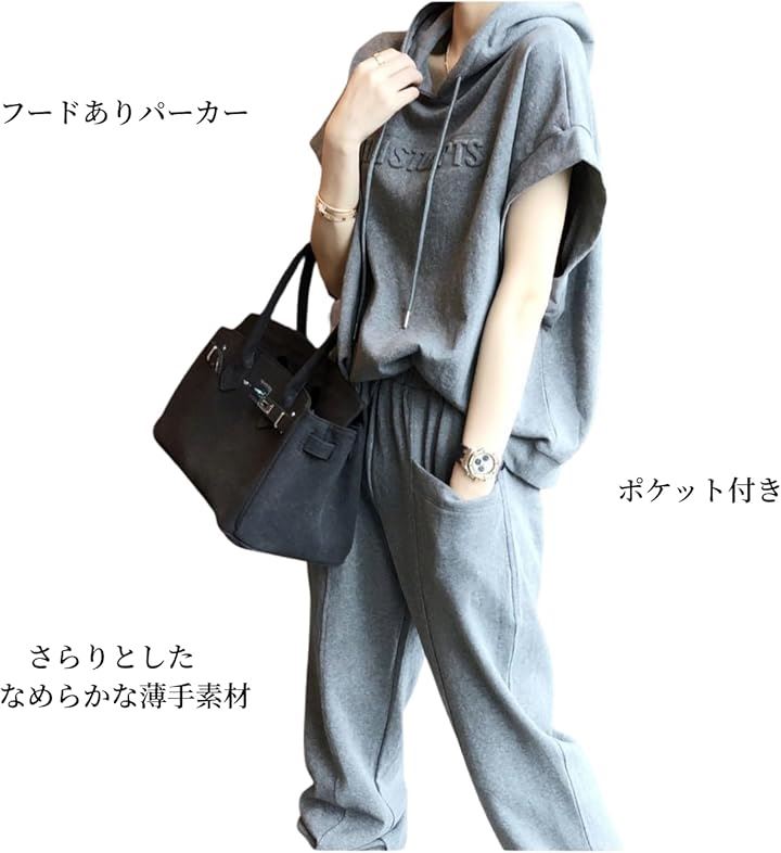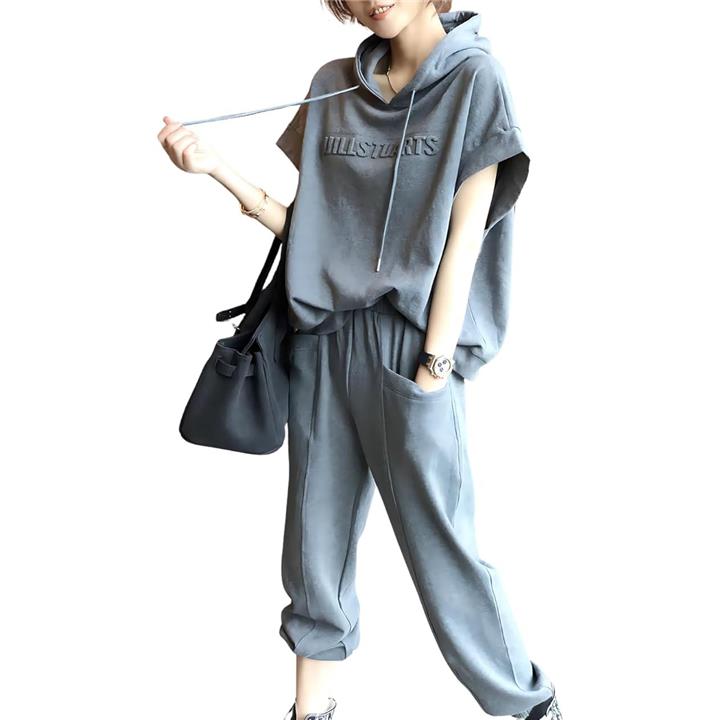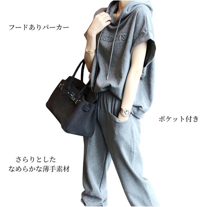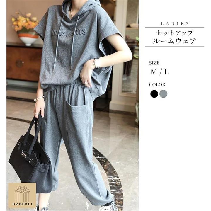 レディース セットアップ スウェット 上下 薄手 半袖 トップス フード パーカー 七分 丈 パンツ エンボス ロゴ 春 夏 秋 部屋着 ルームウェア ジャージ 半そで