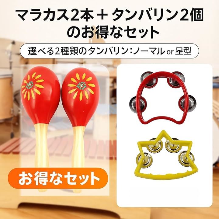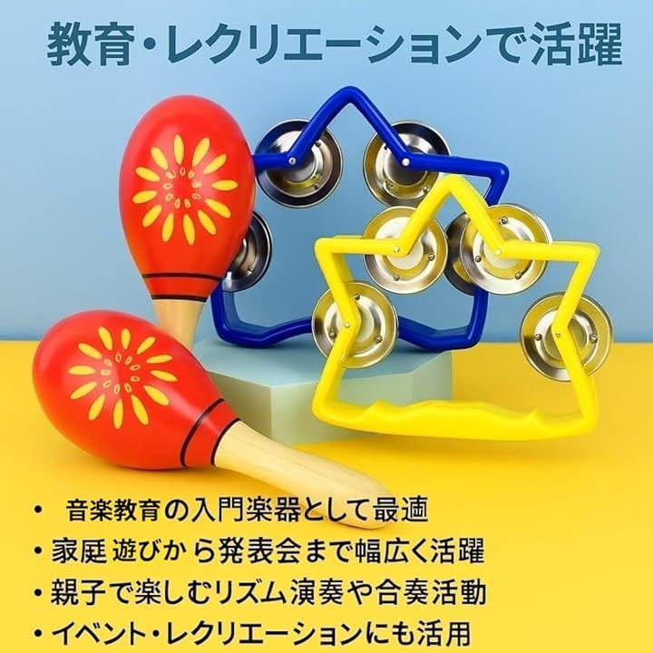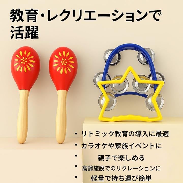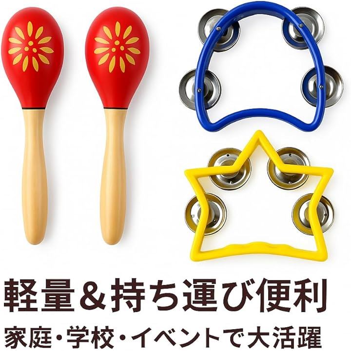 マラカスとタンバリンの組み合わせにより多彩なリズム表現が可能になり、音楽をより身近で楽しいものにしてくれます。