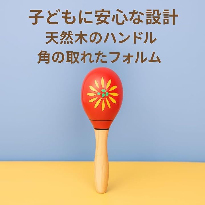 マラカスは木製のハンドルを採用し、赤色に花模様を施した鮮やかなデザインが特徴です。