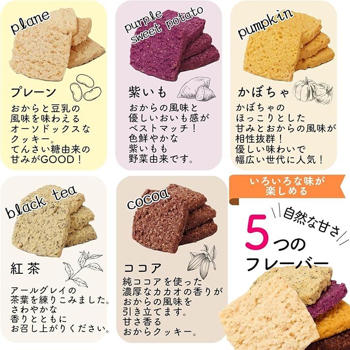 おからクッキー 大容量セット 豆乳 プレーン ココア 紅茶 紫いも かぼちゃ ダイエット お菓子 おやつ 低糖質 対象年齢3歳~