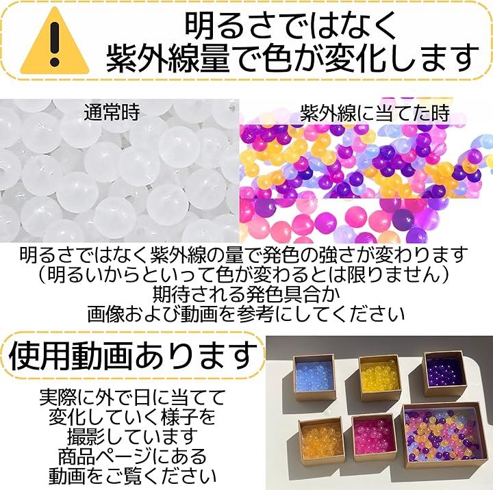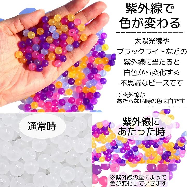 「太陽光線やブラックライトで魅惑的な変色効果」 この特別な変色ビーズは、太陽光線やブラックライトなどの紫外線に当たると、驚くべき変化を見せます。