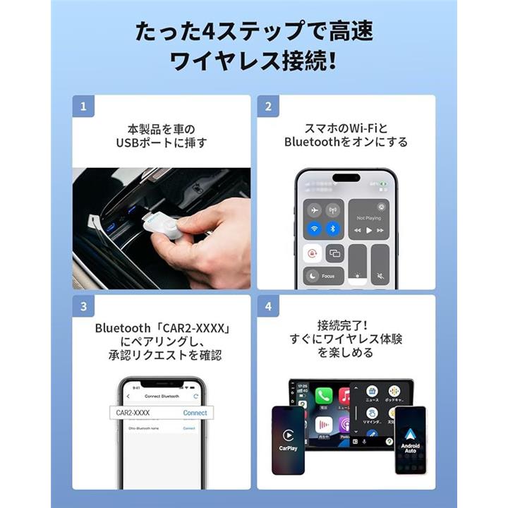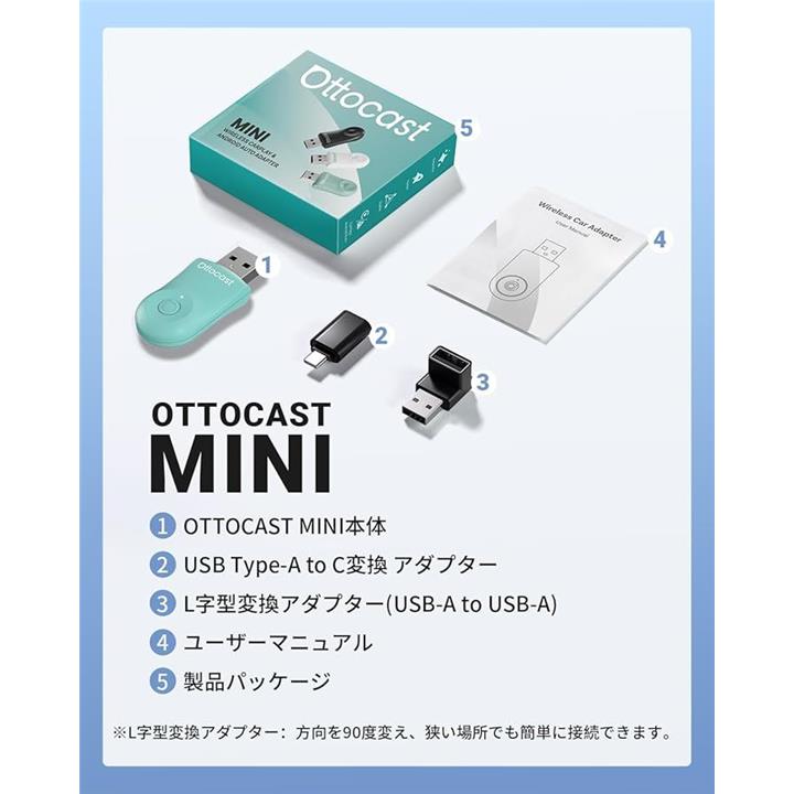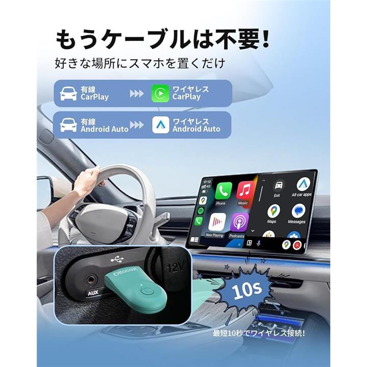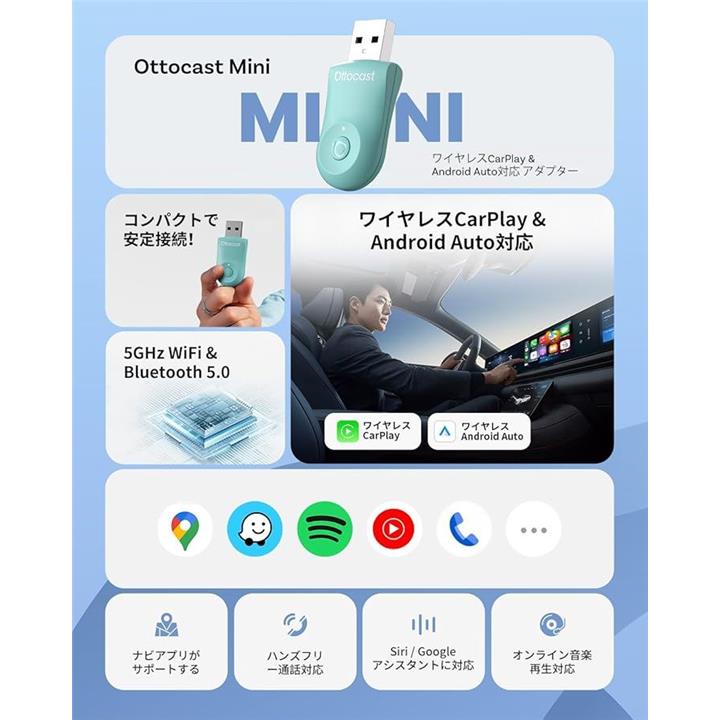 公式 オットキャスト Mini ワイヤレスCarPlay/Android Autoアダプター ミニ 純正有線CarPlay/Android Auto対応車専用 Bluetooth音楽/通話対応 プラグ&プレイ 自動接続 98%以上の車種適合 技適認証取得済