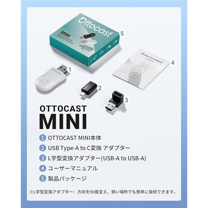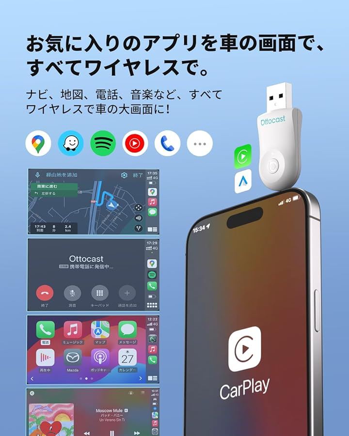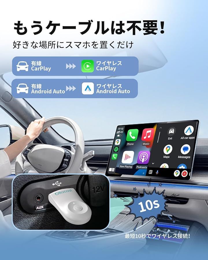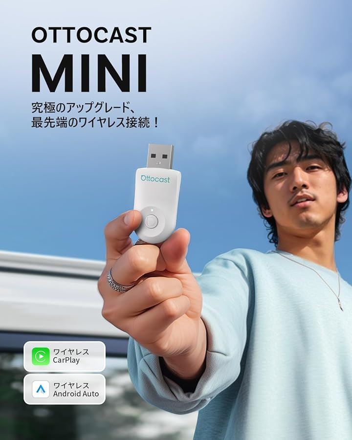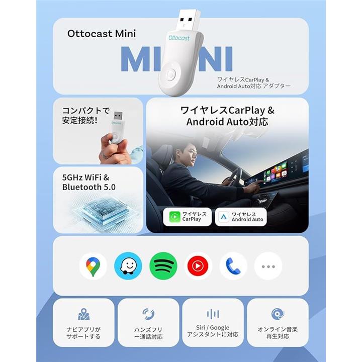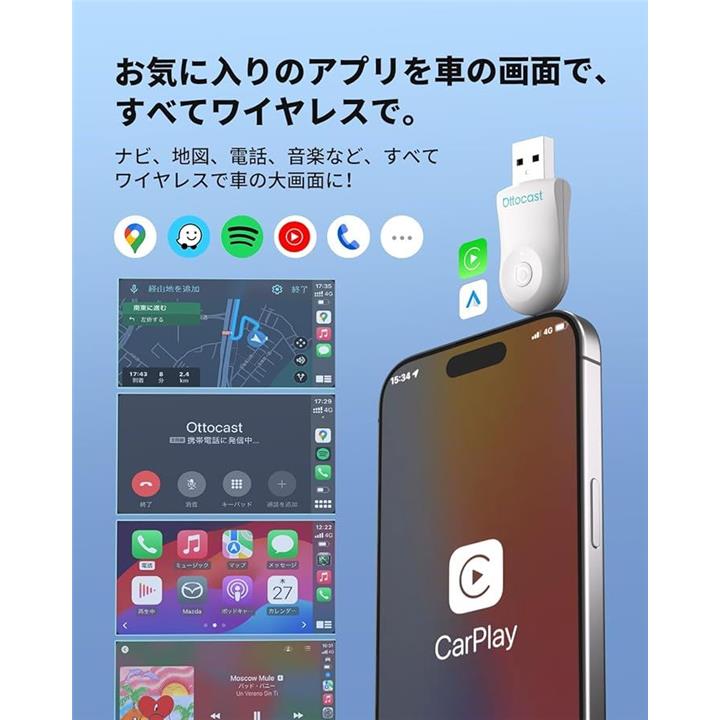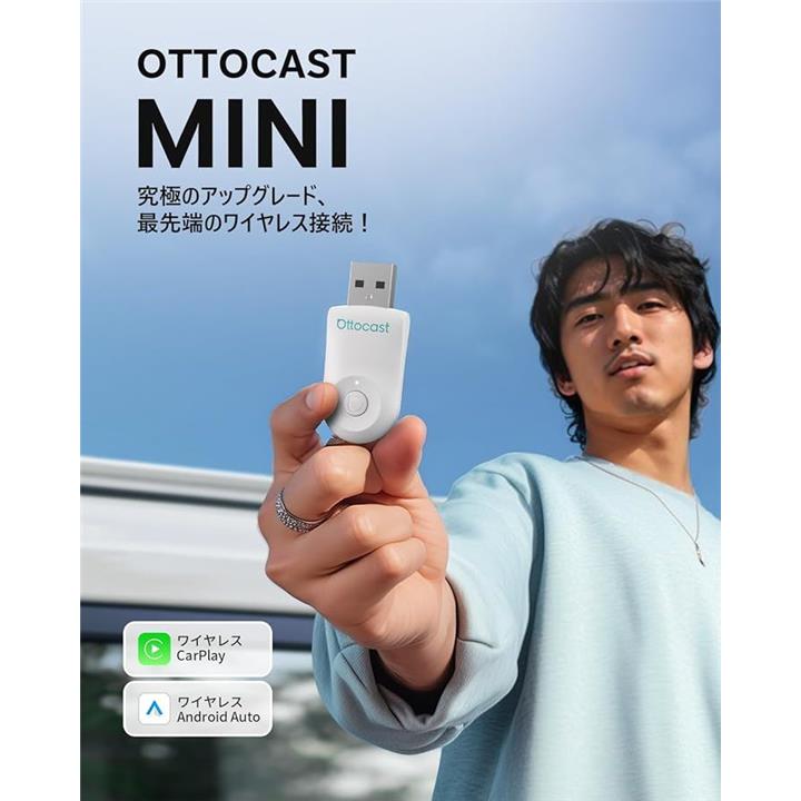 公式 オットキャスト Mini ワイヤレスCarPlay/Android Autoアダプター ミニ 純正有線CarPlay/Android Auto対応車専用 Bluetooth音楽/通話対応
