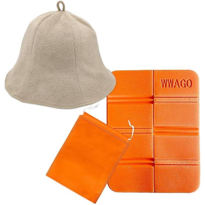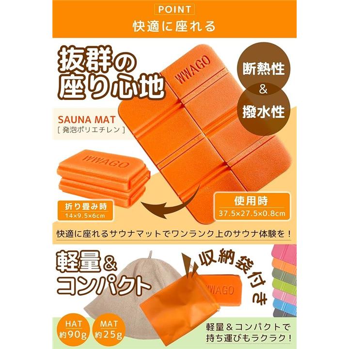 「商品内容」サウナハット:1枚 付属:サウナマット+マット収納袋 「仕様」サウナハットサイズ:頂点からフチまでの長さ(深さ) 約22.5cm 周り約58cm 、素材:綿78%+ポリエステル% 重量:約90g サウナマット:37.5cmx27.5cmx0.8cm (折り畳み時 14cmx9.5cmx6cm) 重量 約25g、素材:発泡ポリエチレン