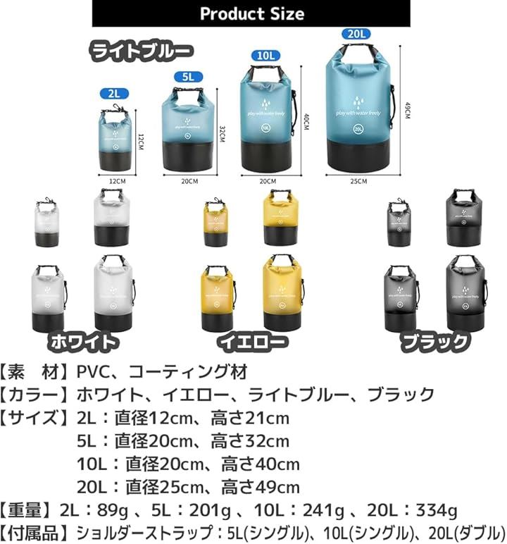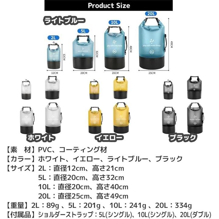 「素材」PVC、コーティング材「カラー」ホワイト、イエロー、ライトブルー、ブラック「サイズ」2L:直径12cm、高さ21cm 5L:直径20cm、高さ32cm 10L:直径20cm、高さ40cm、20L:直径25cm、高さ49cm「重量」2L:89g 、5L:201g 、10L:241g 、20L:334g 「付属品」ショルダーストラップ:5L(シングル)、10L(シングル)、20L(ダブル)