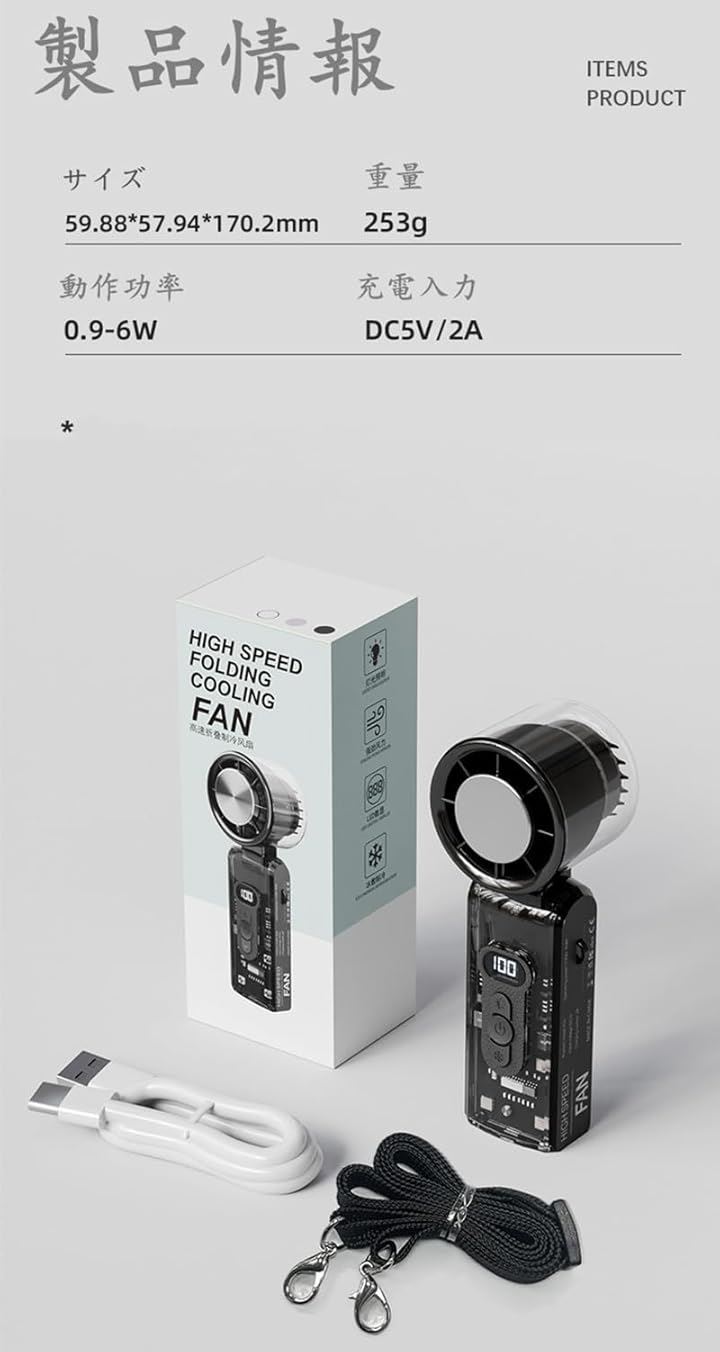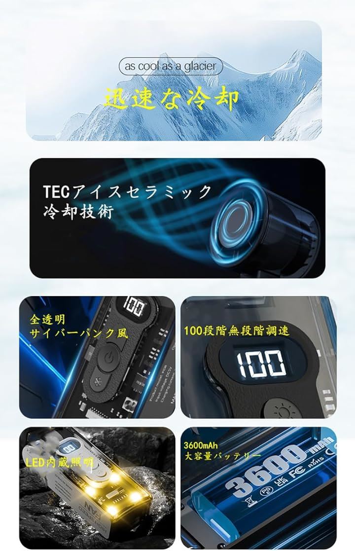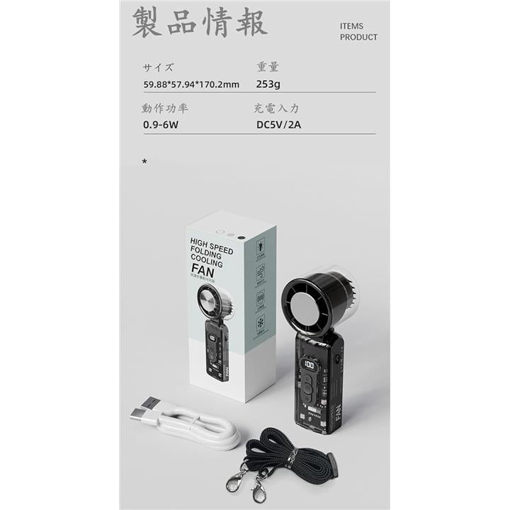 折りたたみ式冷感ファン|大容量3600mAhバッテリー、100段階無段階風量調整、LEDライト付きで室内・アウトドア両用のサイバーパンク風ポータブルファン 製品のポイント:冷風ファン、折りたたみ式、LEDライト付き、LEDにはストロボ機能あり、3600mAhの大容量バッテリー、100段階の無段階調整、室内外両用.ストラップ付き. 通勤や通学、ショッピング、散歩、スポーツ観戦、花火大会、フェスティバル、アウトドア活動、キャンプ、旅行、ハイキングなど、屋内外で幅広く使用できるミニファン。