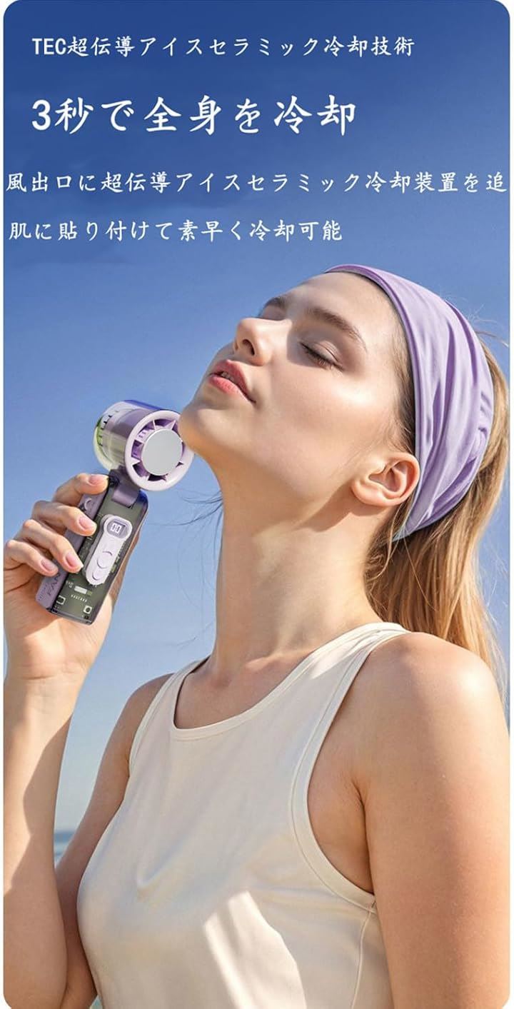 ポータブルファンは冷却プレートを搭載しており、ただ風を送るだけでなく、風を送る際に冷却スイッチを押すと、加熱プレートが素早く冷却され、頬や喉、手首、首元などがひんやりと感じ、肌が瞬時に冷却されます。