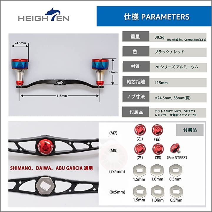 ・「サイズ」ノブ直径24.5mm、ハンドル軸心距離115mm 「総重」38.5g「素材」70シリーズ航空アルミ「リールハンドル付属」DAIWA ナット2個、SHIMANO ナット2個、DAIWA STEEZ ナット1個、6角ワッシャー 6個(取付部4x7mm、5x8mm)、梅レンチ1個。